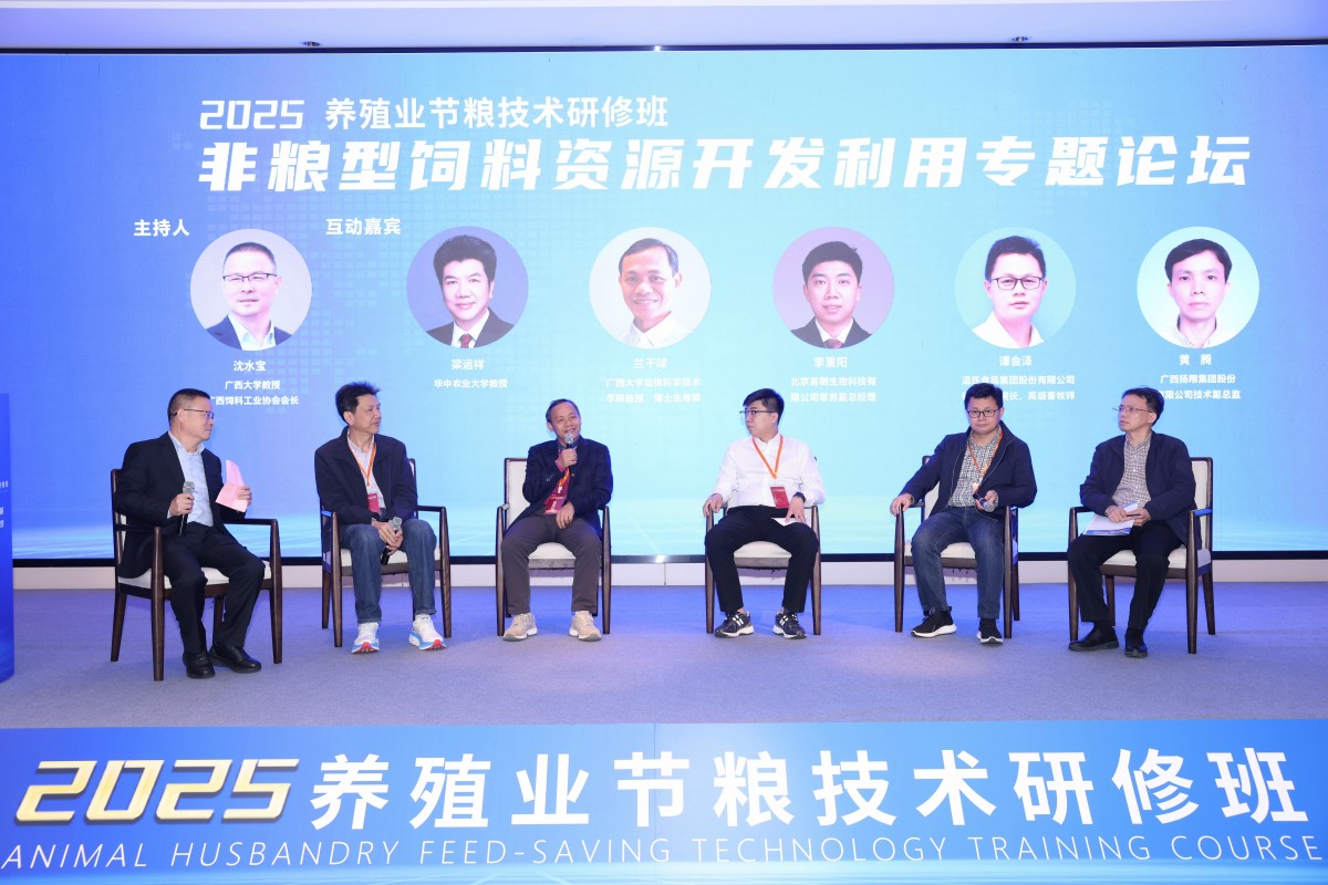 專題論壇環節,在沈水寶教授的主持下,華中農業大學教授梁運祥、廣西大學動物科學技術學院教授蘭干球、北京首朗生物科技有限公司常務副總經理李重陽、溫氏食品集團股份有限公司研究院副院長譚會澤、廣西揚翔集團股份有限公司技術副總監黃騰5位嘉賓圍繞“非糧型飼料資源開發利用”展開深度對話。討論直擊技術轉化難點、政策落地需求及產業鏈上下游協同痛點,為破解 “人畜爭糧” 難題提供了貼合產業實際、具備可操作性的新思路、新路徑。