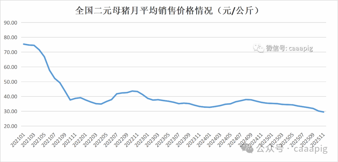 1、2025年11月份全國二元母豬銷售價格29.51元/公斤,環比下跌2.3%,同比下跌18.0%。