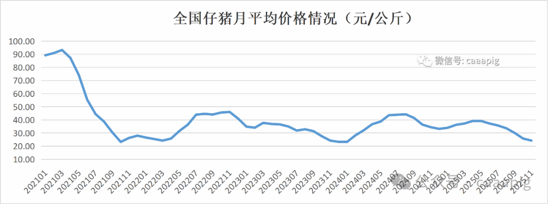 2、2025年11月份全國仔豬價格24.25元/公斤,環比下跌6.0%,同比下跌29.5%。