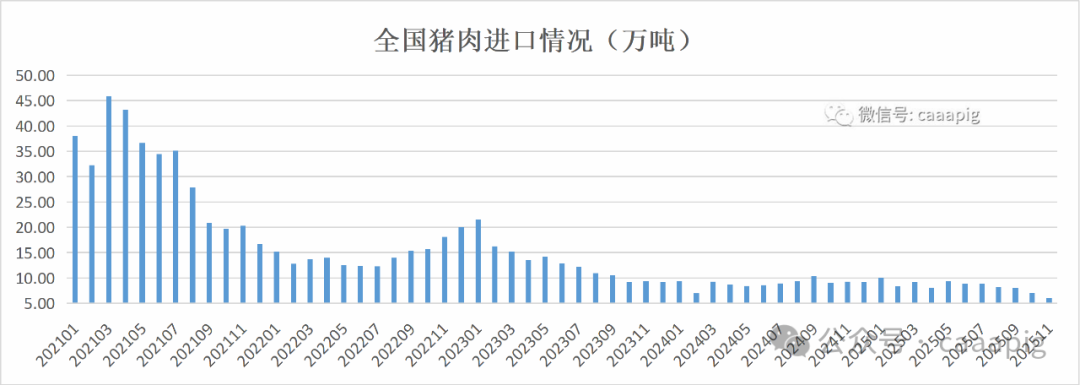 5、2025年1-11月累計進口豬肉91.97萬噸,同比下降6.2%。