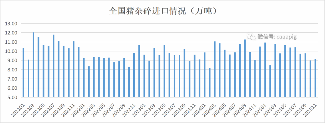 2、2025年11月進口豬雜碎9.16萬噸,環比增長1.9%,同比增長1.0%。